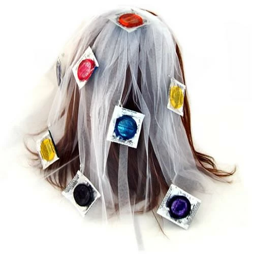 The Condom Veil certainly makes a statement… That your Bachelorette is “up” for anything! The package includes the veil with 8 condoms of assorted colors.