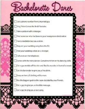 Dare to Do It checklist is for the Bachelorette Party that is headed out for a evening of wild fun. Hand a checklist to each member of the Bride to Be’s Party Crew or just focus on the Bachelorette. They will be challenged by this list of 10 dares plus it will keep the party moving. Give a Prize to the person that finishes the dare sheet first or help the Bachelorette complete her dares.Take photos of the Bride performing each dare for the party album. The dares are challenging but still fun. Example: Swap an item of clothing with a man or Call an Ex!
