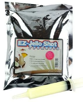 This is not your grammy’s jello! Directions are on the pkg…. Just add 1.5 cups of alcohol (rum, vodka, etc.) and 2.5 cups of boiling water and voila! A delicious concoction that pours into approx. 30- 1.5oz. shot glasses or syringes. What an easy and inexpensive way to get your friends drunk!