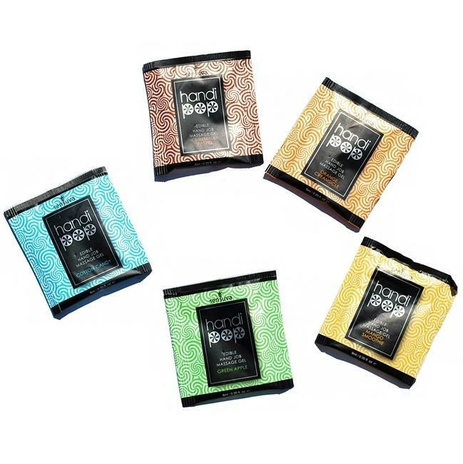 Add the Handipop Edible Hand Job Massage gel to your bachelorette or bachelor party favors or your gift for the Bride. Each handipop packet is a quality massage gel that will make giving a hand job easier for you and even more pleasurable for him- and it’s edible! The right size to stick in your pocket or your bag. This long lasting hand job gel is available in an assortment of yummy flavors: Cotton Candy, Green Apple, Orange Creamsicle, Mango Smoothy, Strawberry and Cinnamon Pastry.