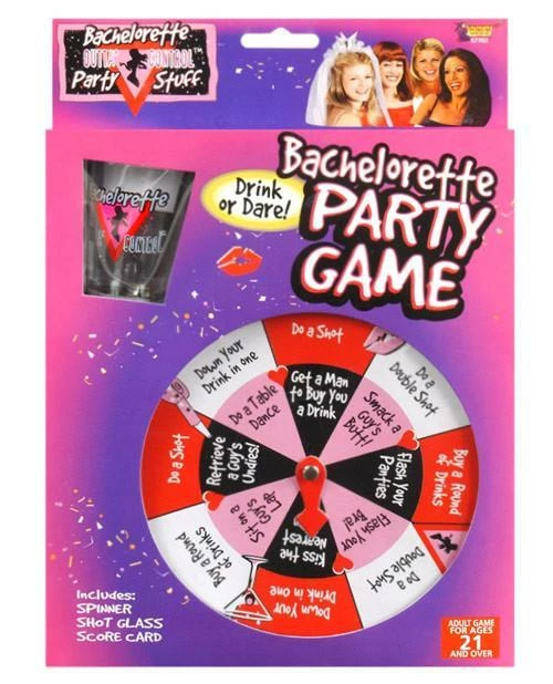 Play the Bachelorette Party Drink or Dare Game and see how wild your girl’s night out can be! Includes the Bachelorette Outta Control Shot Glass. Use the spinner board to find out what the drink and the dare is… the Bachelorette then gets to choose if she wants the drink or the dare. The guest that did the spin then does the other. The Bachelorette then fills out her score card to see how she rates by the end of the night! The more dares she completes the more outta control she is!!! This game keeps the partys attention where it matters on the Bachelorette! It will add to the festivities and raise the bar for party fun. Drink a Shot or Get Naughty..Search other Outta Control Bachelorette Party items and party decorations.
