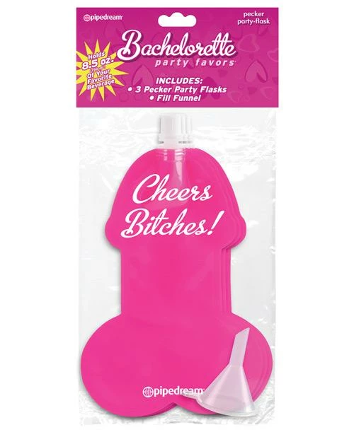 The reusable Pecker Party Flask will carry your favorite beverage in style! Bright Pink with Cheers Bitches in white on each flask. Holds 8.5 oz and is 9 x 6 inches. Hand these out to each guest or place in their party favor bags. Get the Bachelorette, Girl’s Night Out or Adult party off to a great start. Cheers Bitches!!!